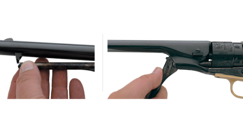 To seat black powder loads in the cylinder of the single-action army and navy revolvers, the loading lever is freed from the latch and pulled downward. This causes the ramrod to move through the frame and ram the load home.