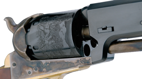 340350 | 1849 Pocket Revolver | $429 | .31 | 4" | Case-Hardened | 5-shot, engraved | Standard | Walnut | Octagonal | Blue | Brass | Brass | 7 | 1:32, LH | 9.5" | 1.5 lbs |